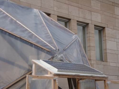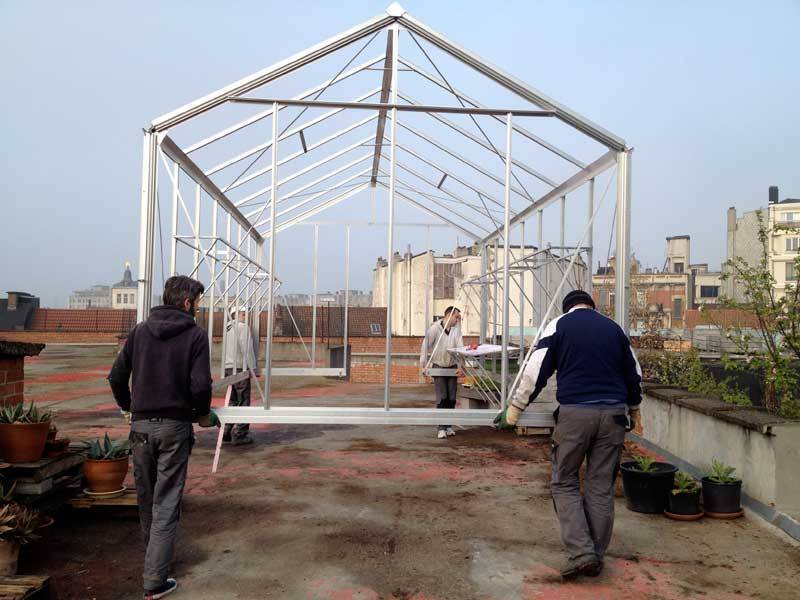 - Trouver le lieu adéquat : un toit plat avec un revêtement étanche, une portance suffisante, une bonne exposition, de bonnes voies d’accès, des gouttières qui pour collecter l’eau de pluie, des tuyaux d’évacuation, des rambardes… Certains toits de grande envergure pourraient réunir ces conditions : comme celui de la bibliothèque du Solbosch (ULB) et et celui du Parking 58, propriété d’Interparking.