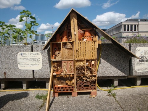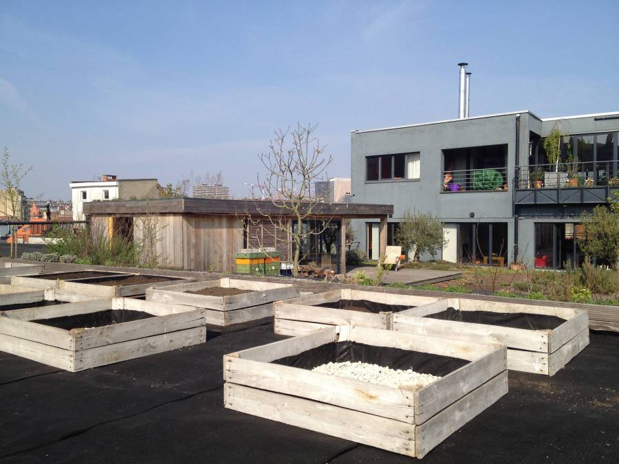 Un bâtiment impersonnel à deux pas de la place Saint-Catherine : la façade sans charme de cet immeuble ne laisse en rien présager qui se trouve aux étages. J’ai rendez-vous chez Anne-Marie – une des habitantes de l’immeuble – qui a gentiment accepté de m’accorder une interview au sujet de son magnifique potager. Il y a 3 ans, cette artiste passionnée d’écologie et d’apiculture a pris la résolution de créer, sur son toit, une ferme urbaine : entre 2012 et aujourd’hui, elle y a construit une serre, y a fait pousser des arbres fruitiers et y a disposé 54 conteneurs de 125x125cm ; dans lesquels elle fait aujourd’hui pousser toutes sortes de plantes, notamment les plantes mellifères nécessaires à son rucher :