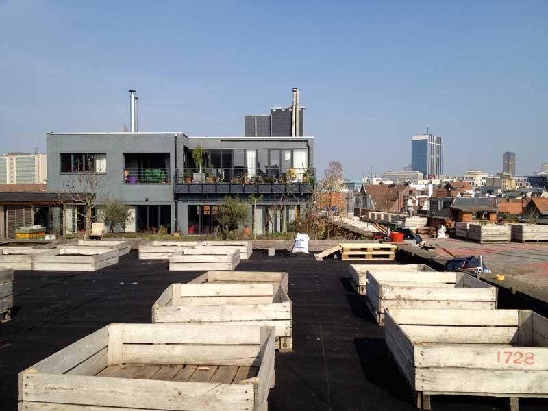 Dans le cadre de l’association d’artistes Okno vzw (opengreenconnected), Anne-Marie a également lancé un potager sur le toit de l’immeuble situé au numéro 34 du quai des charbonnage, dans la commune de Molenbeek-Saint-Jean, le long du canal. Elle ne cherche pas seulement à mettre en place de toitures vertes mais également à développer des réseaux, des corridors écologiques, parsemés de plantes mellifères et des ruchers.