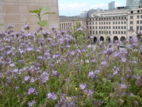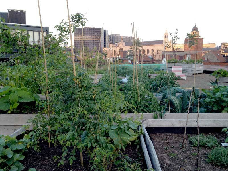 Sur ses nonante mètres carrés de toiture, le potager du « petit peuple des toits » fait pousser entre autres de la bourrache blanche et bleue, de la sauge, de la menthe, des groseilles, des framboises, des fraisiers et, enfin, de l’ail ; qui donne aux fraisiers un feuillage plus abondant et des fraises plus grosses…