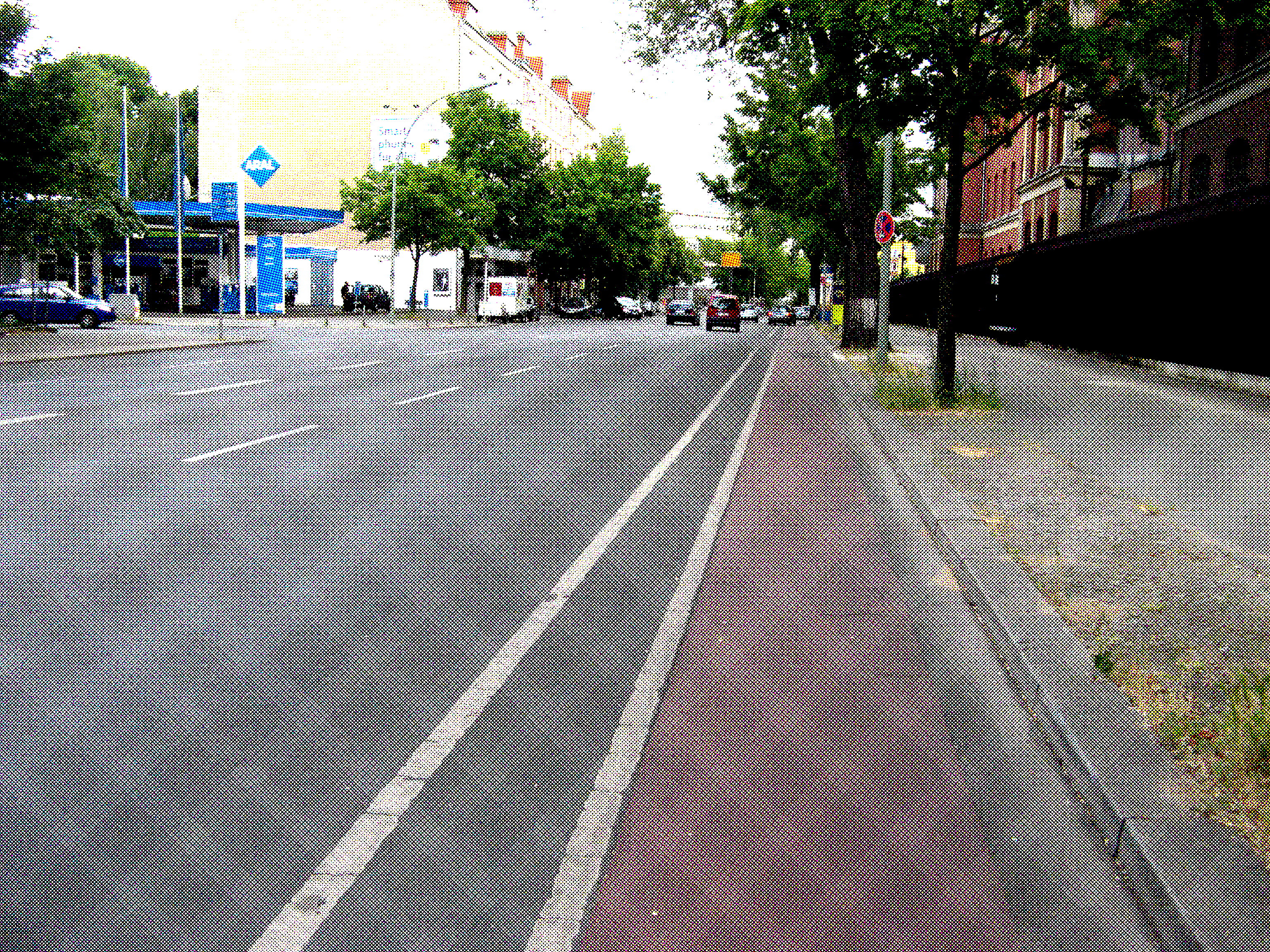 Bruxelles Mobilité n’utilise donc le terme de « bande cyclable » que pour désigner les aménagements au niveau de la chaussée, sans lignes blanches. « Bandes cyclables suggérées » renvoie, en effet, à la fois aux chevrons accompagnés de pictos et aux bandes colorées sans pointillés blancs. Mais – me demanderez-vous – qu’en est-il alors des vraies « bandes cyclables » (tracées avec des lignes en pointillés et un revêtement thermoplastique) ? Eh bien, elles ne sont pas considérées – dans la novlangue locale – comme des « bandes », mais comme des « pistes cyclables marquées », n’en déplaise aux gens pointilleux pour qui, en français, une « piste » signifie non pas « une portion de voirie carrossable avec une bande pour les vélos » mais un « chemin réservé à certaines catégories d’usagers » (en l’occurence, les cyclistes).