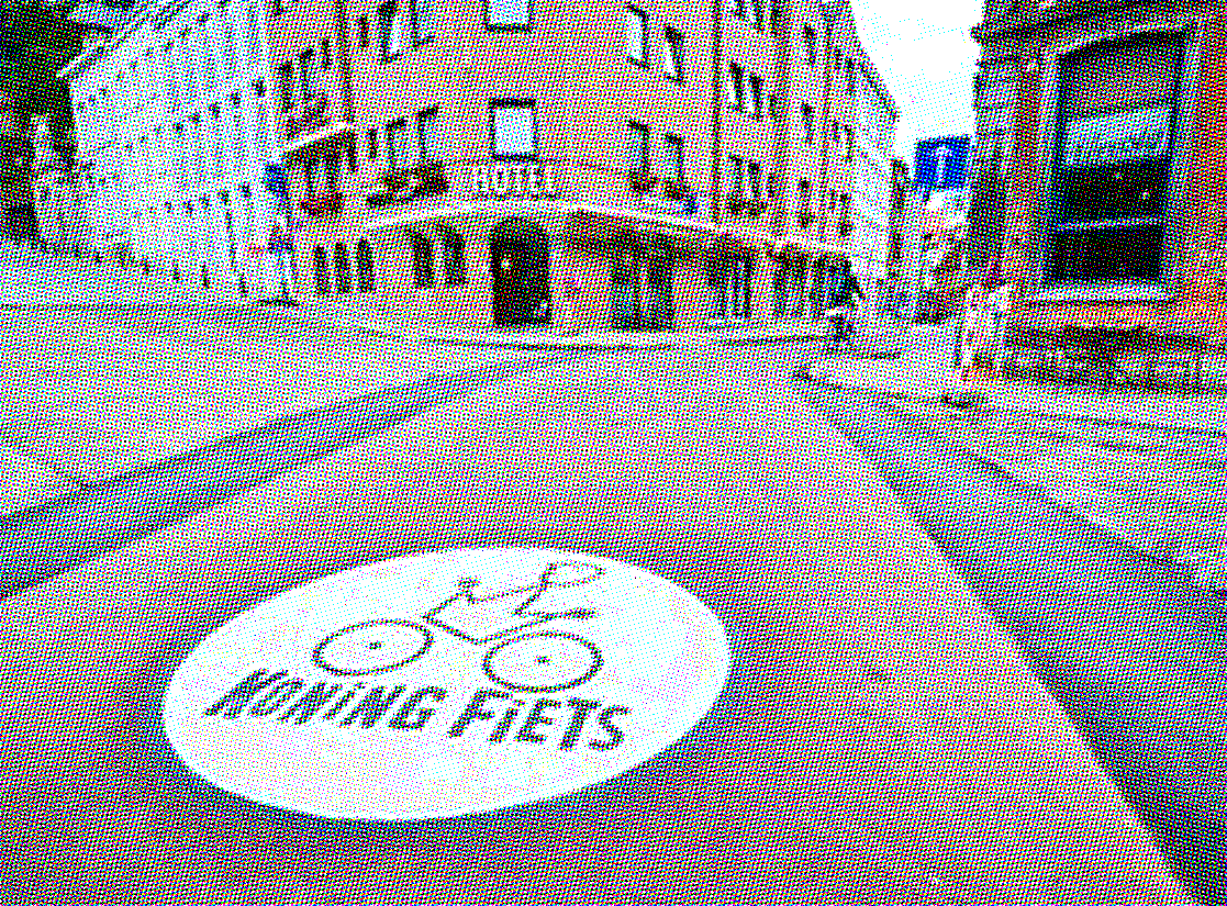 Un autre exemple de « maximalisme bruxellois » en matière de mobilité vélo, c’est ce tronçon de l’avenue Louise sans revêtement de couleur et saturé de pictos « vélo » (voir : première photo en partant de la droite). La première fois que j’y suis passé, j’ai cru à une blague. Non, en réalité c’est une « rue cyclable », n’en déplaise aux grosses berlines allemandes qui s’impatientent dans votre dos, visiblement insensibles au pouvoir de « suggestion » de ce bel aménagement. L’idée de départ est pourtant excellente. Elle nous vient de Gand. L’administration gantoise invente – en 2011 – un nouveau type d’infrastructure mixte : une rue où les voitures sont tolérées, mais doivent adapter leur vitesse à celle des vélos, lesquels ont le droit de circuler sur toute la largeur de la chaussée. L’expérience à été reproduite dans de nombreuses villes de Flandre et des Pays-Bas avec pour point commun l’utilisation d’un revêtement thermoplastique de couleur vive, … et non de simples pictogrammes. Bruxelles n’a pas suivi.