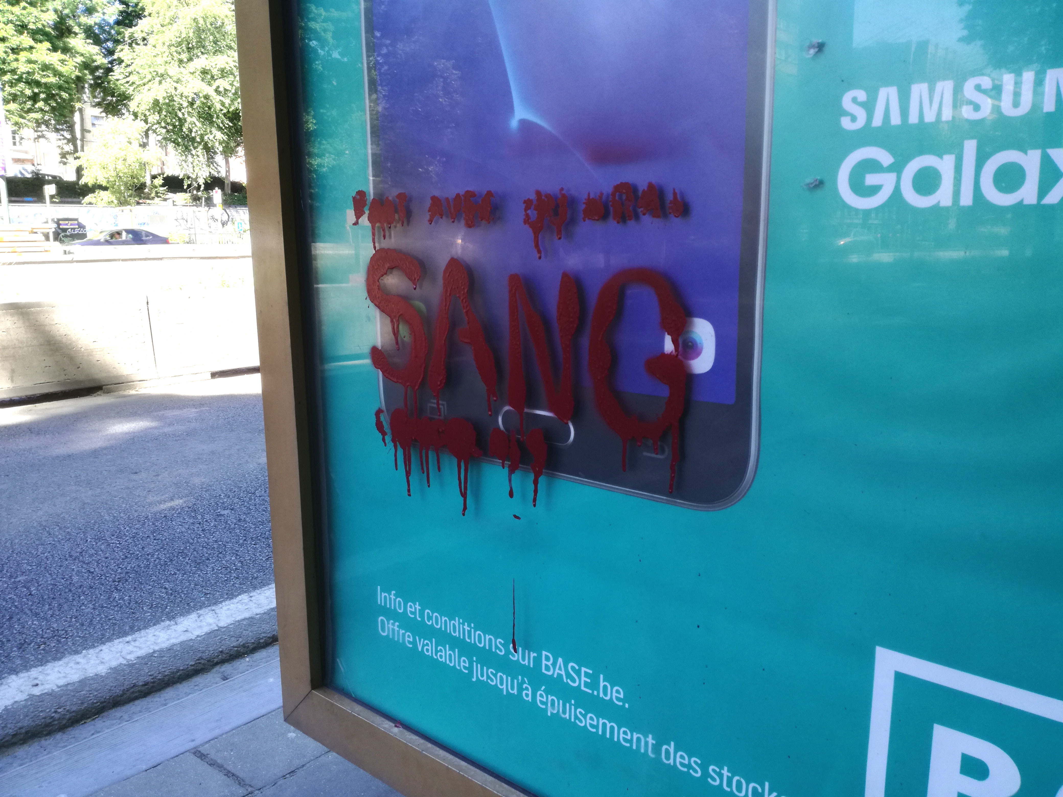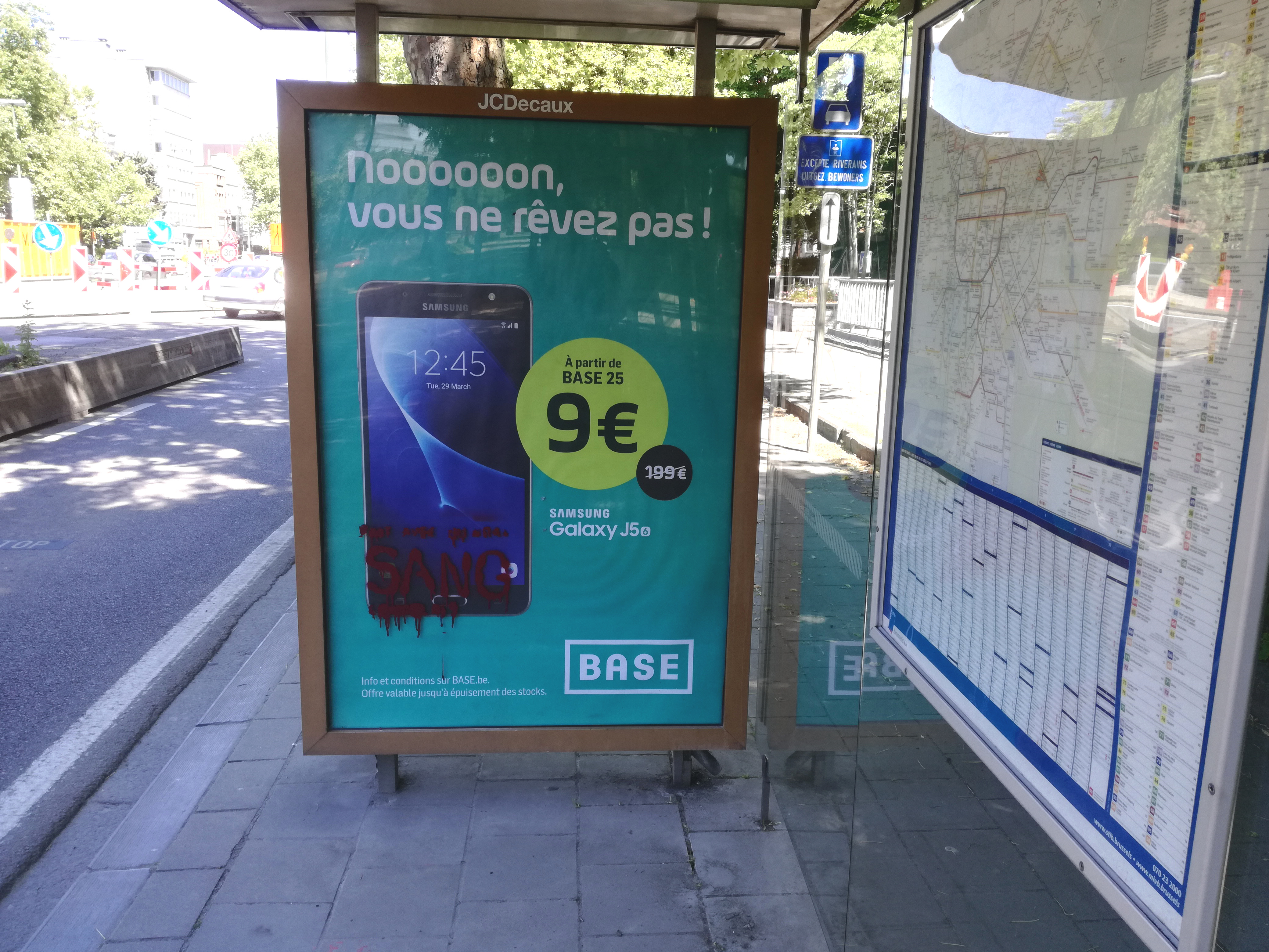 - Graffiti sur une pub’ Samsung, au Square Vergotte, à Schaerbeek (Crédit photo : Ezelstad – CC-BY-SA)