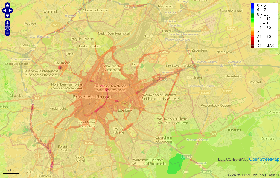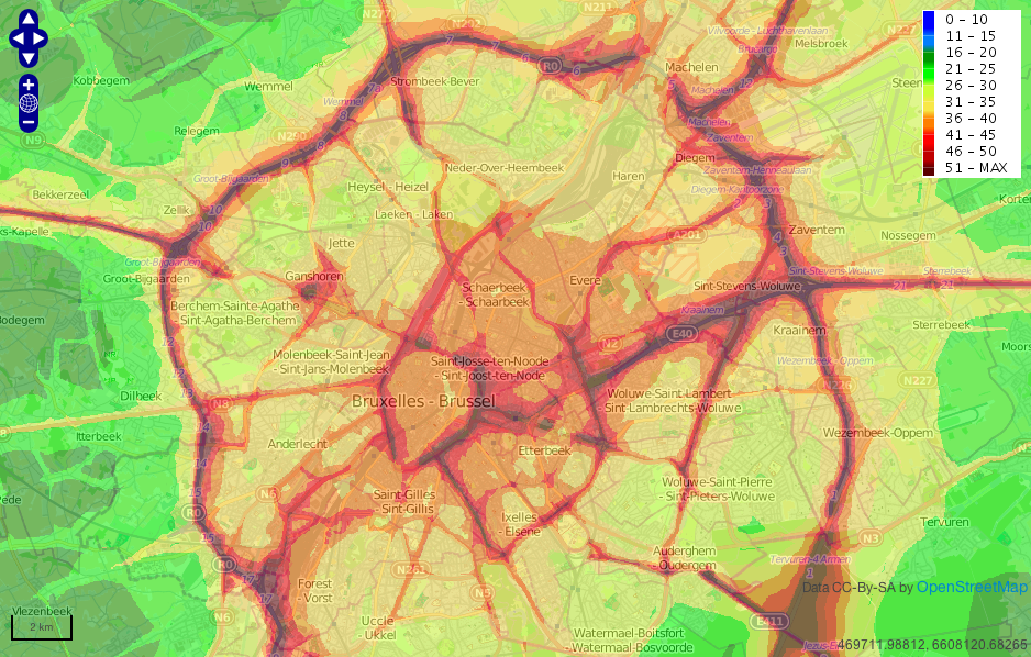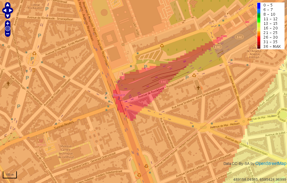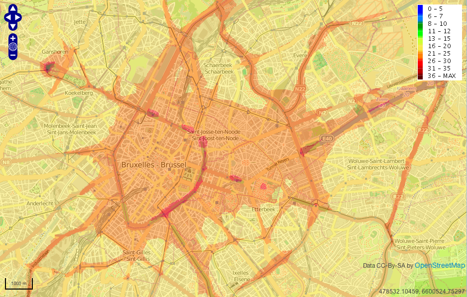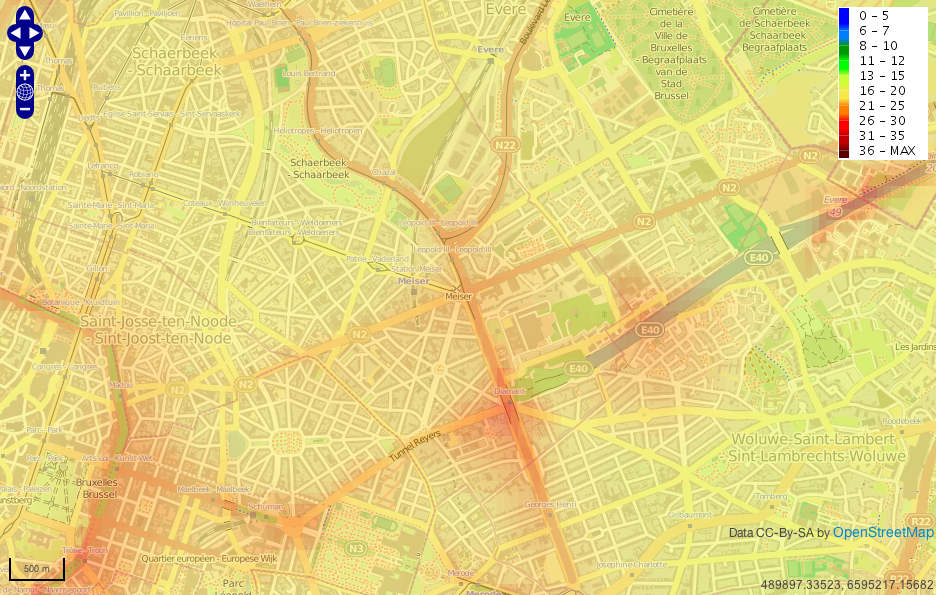 J’y apprends qu’il y a des particules qui sont réparties de manière uniforme sur la ville ; vis-à-vis desquelles on loge à peu près tous à la même enseigne (O3, PM10). Et, qu’il y en a d’autres – telles que les particules fines et le dioxide d’azote – qui sont concentrées dans certaines zones de Bruxelles. Bon, je ne vous apprends rien en vous disant que le quartier Reyers-Diamant ne fait pas précisément partie des « bons quartiers ».